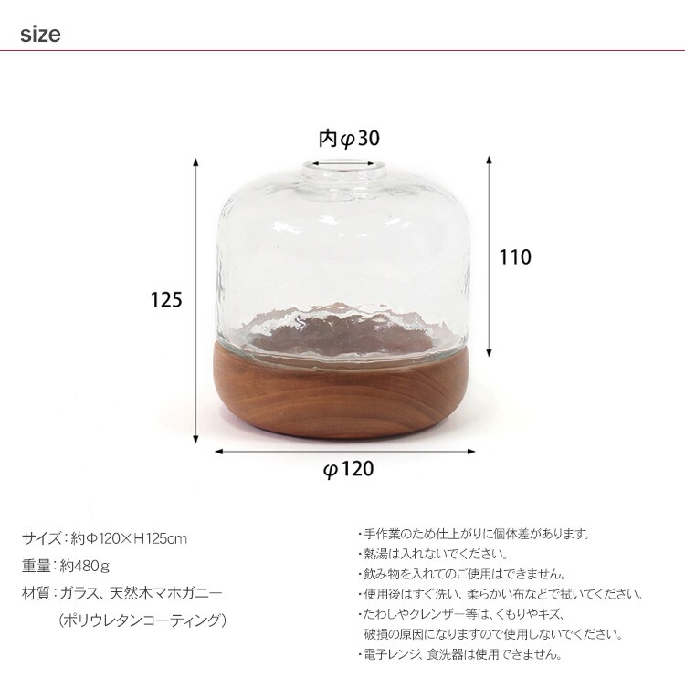 商品説明:ハンマートーン仕上げのガラスとマホガニー製の土台がセットになったフラワーベースです。