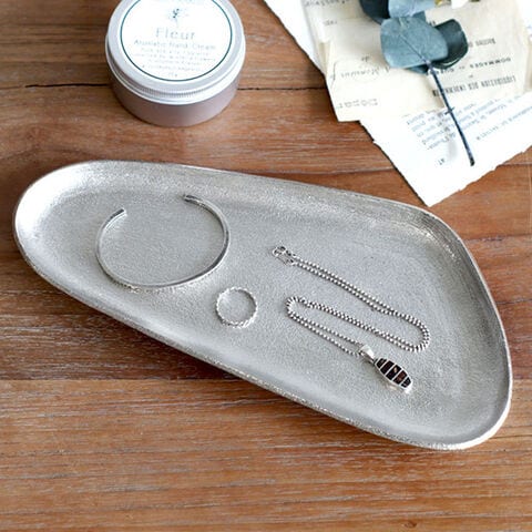 商品説明:アルミ本来のシルバー色を活かしたハンドメイドのアルミトレイ。