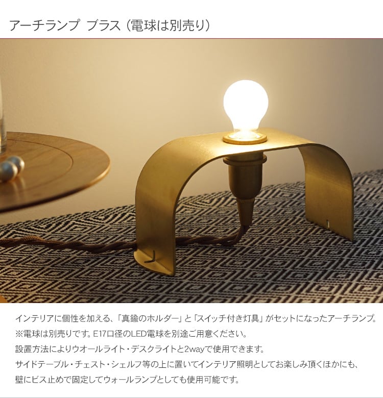 インテリアに個性を加える、「真鍮のホルダー」と「スイッチ付き灯具」がセットになったアーチランプ。