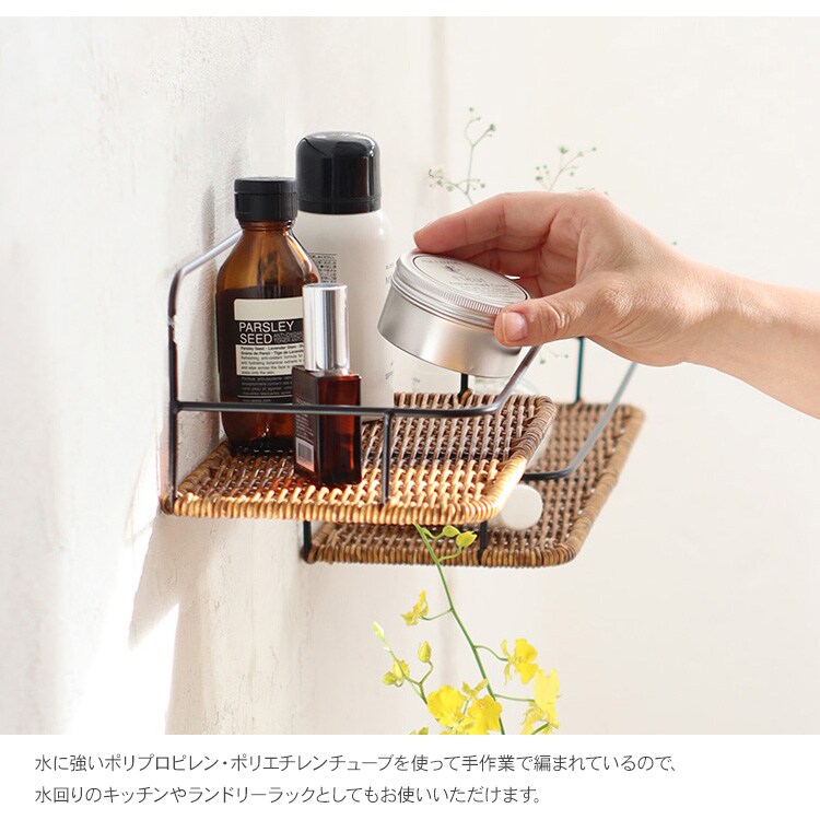 水に強いポリプロピレン・ポリエチレンチューブを使って手作業で編まれているので、水回りでもお使いいただけます。