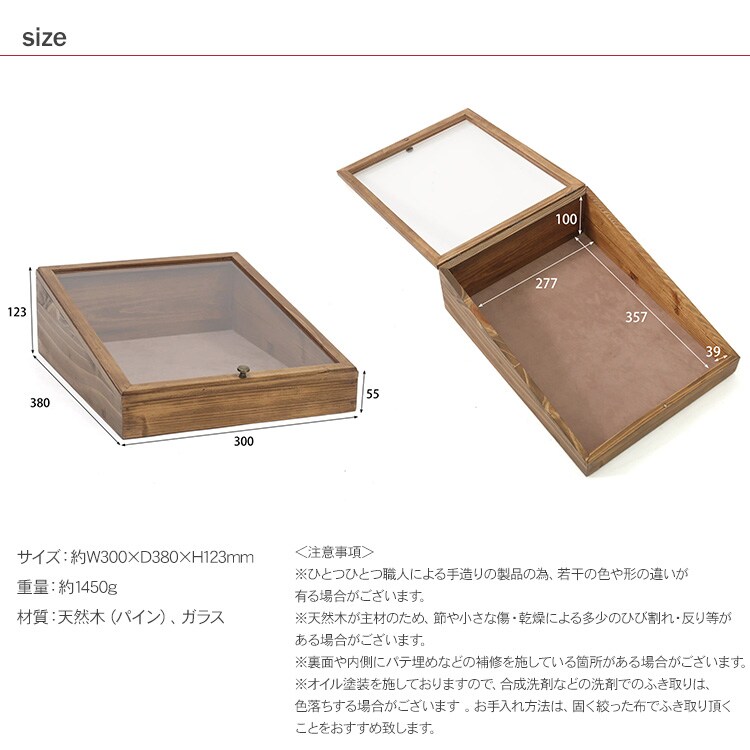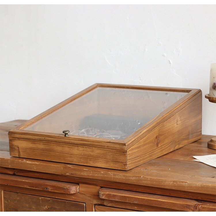 手前から奥にかけて斜めになっているので中の物を見やすく、立体的にディスプレイをお楽しみいただけます。
