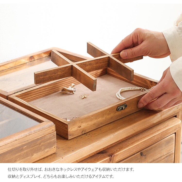 仕切りを取り外せば、おおきなネックレスやアイウェアも収納いただけます。
