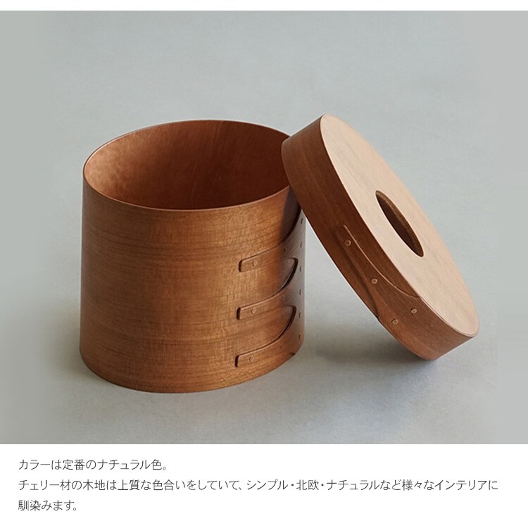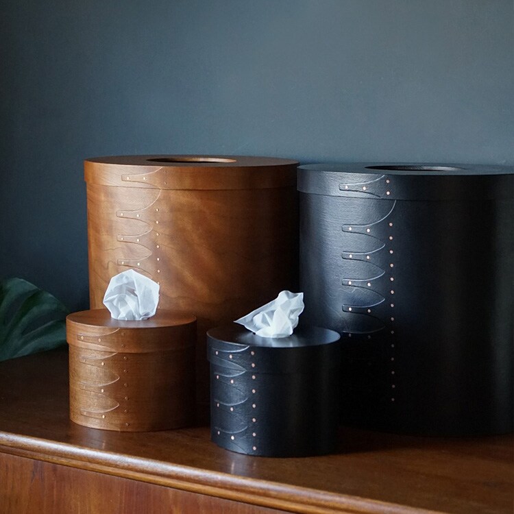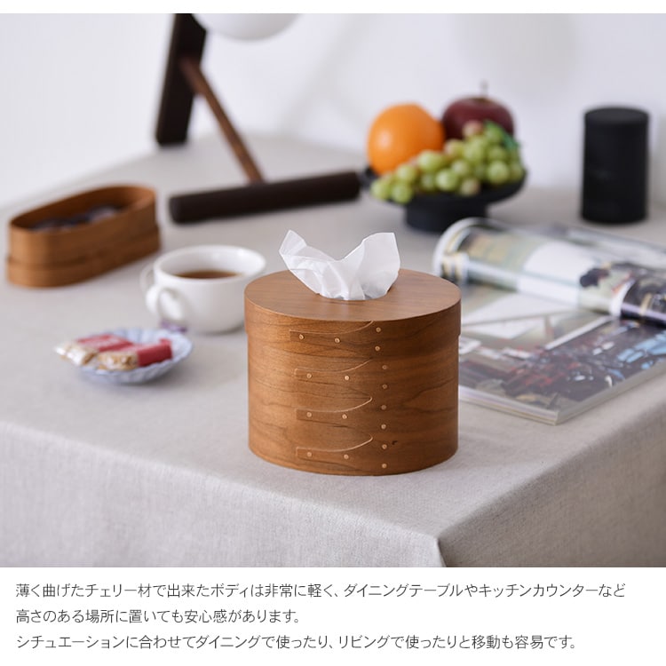 端正な曲げ木のボディ、比翼と留具の処理など、シェーカーボックスの持つデザインはそのままに、ティッシュが引き出しやすいようなスリット等の工夫が凝らされています。