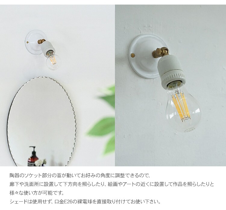 陶器のソケット部分の首が動いてお好みの角度に調整できるので、廊下や洗面所に設置して下方向を照らしたり、絵画やアートの近くに設置して作品を照らしたりと様々な使い方が可能です。