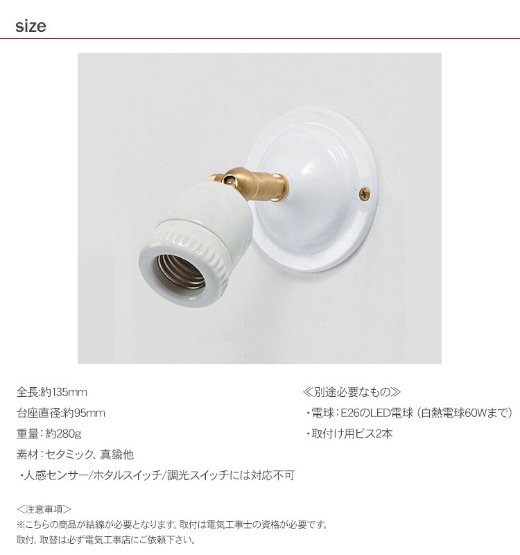 別途必要なもの:電球:E26のLED電球(白熱電球60Wまで)、取付け用ビス2本