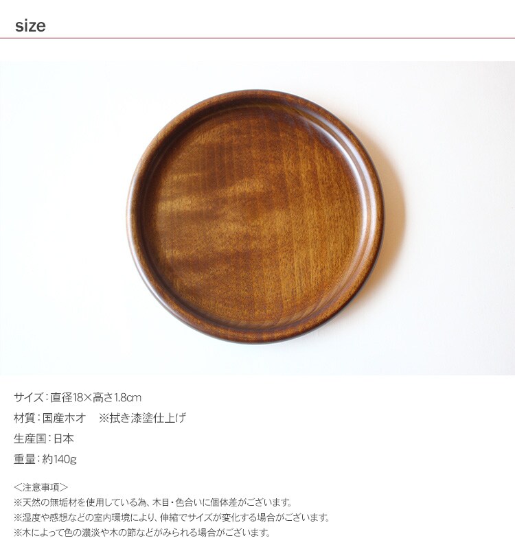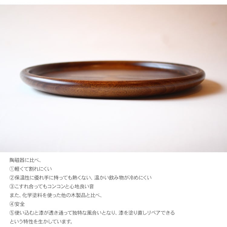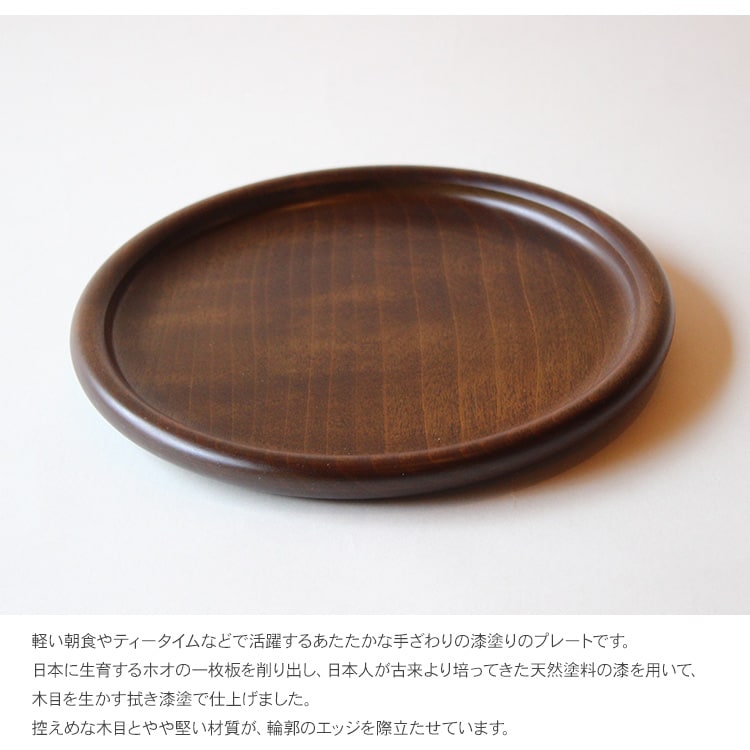 軽い朝食やティータイムなどで活躍するあたたかな手ざわりの漆塗りのプレート 日本に生育するホオの一枚板を削り出し、日本人が古来より培ってきた天然塗料の漆を用いて、木目を生かす拭き漆塗で仕上げました。