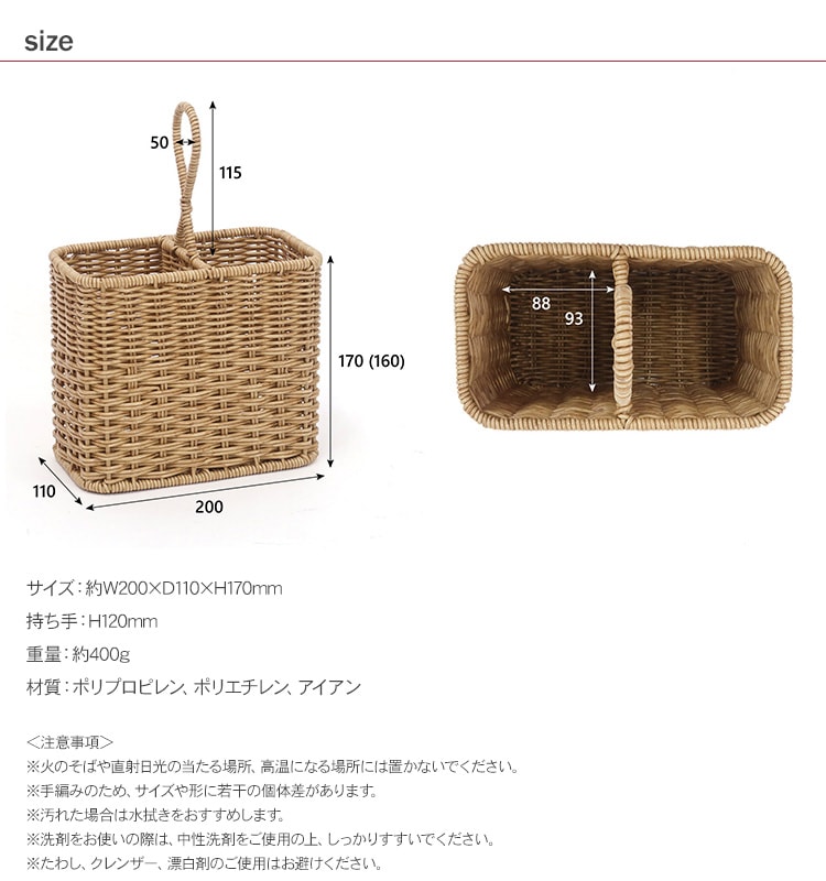 サイズ:約W200×D110×H170mm(持ち手:H120mm)