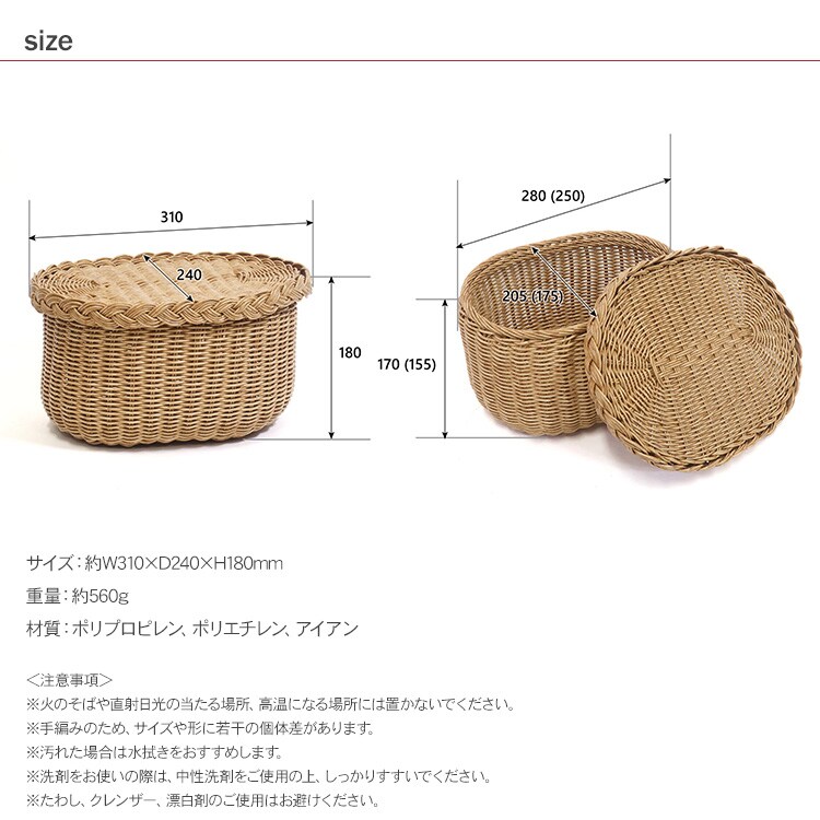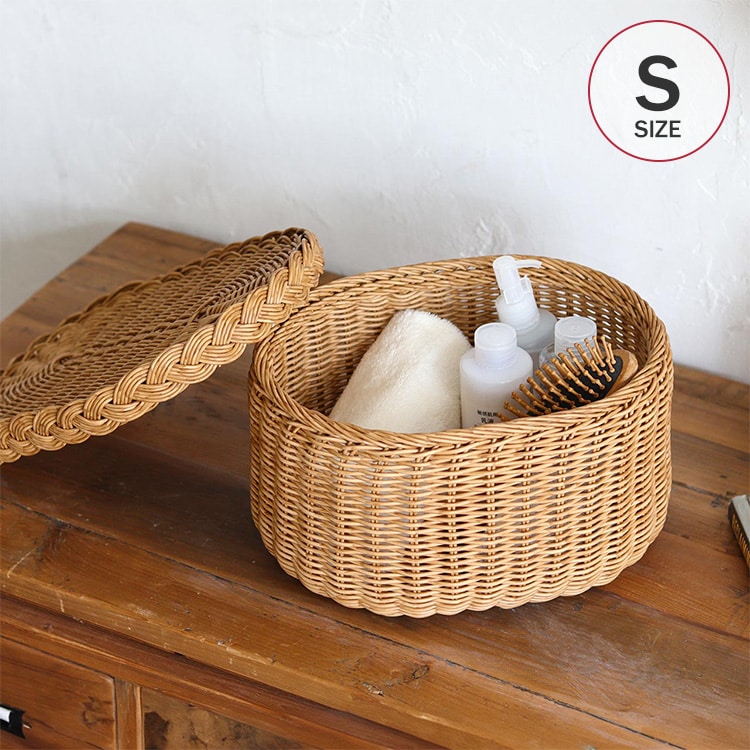 自然な温かみのあるPPラタンで編み上げたオーバル型のバスケット。フタ付きなので散らかりがちな物の目隠し収納にぴったり。縁取りがポイントになったフタは裏返してトレイとしても使えます。