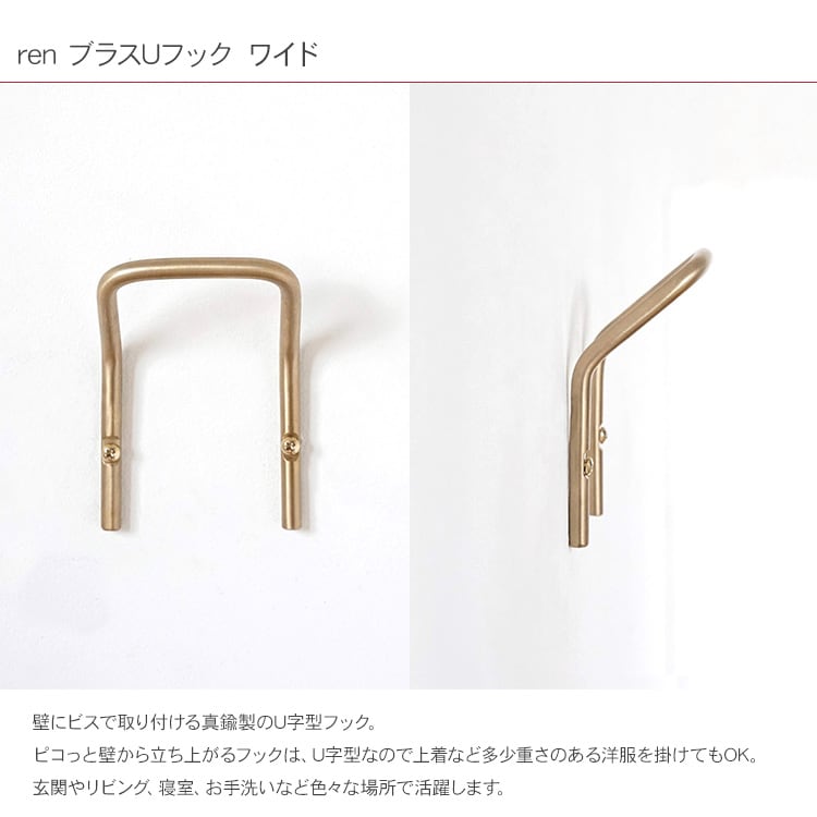 ren ブラスUフック ワイド ハンガーフック タオル掛け コート掛け 壁掛けハンガー 壁面収納 壁掛け DIY 真鍮