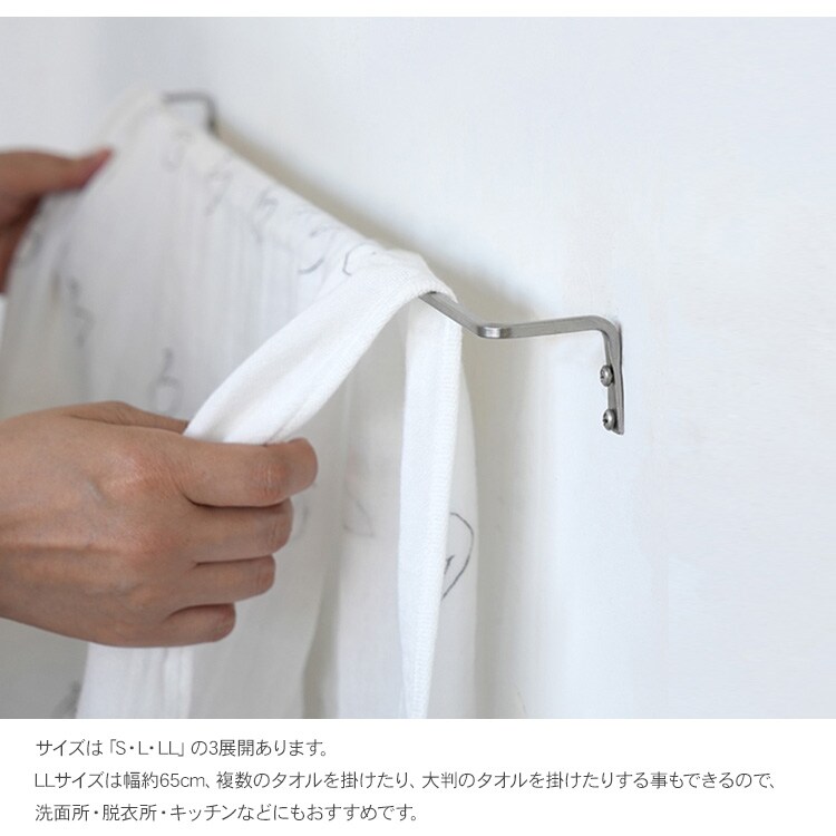 「ステンレスタオルレール LL」は幅約65cm、複数のタオルを掛けたり、大判のタオルを掛けたりする事もできるので、洗面所・脱衣所・キッチンなどにもおすすめです。