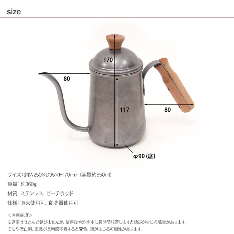 コーヒーケトルは1人~2人分のドリップコーヒーにちょうど良い容量約650ml。