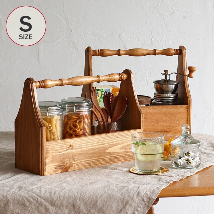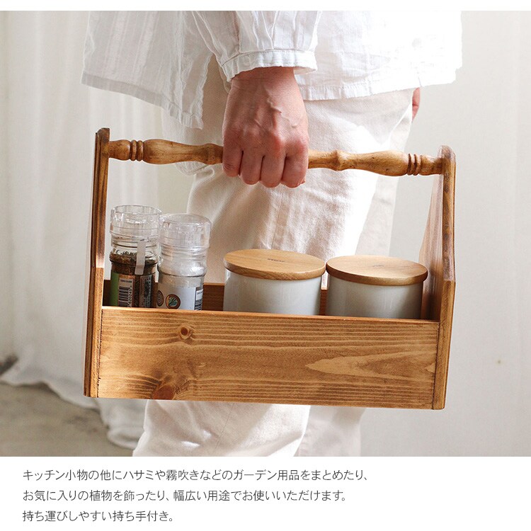 キッチンやリビングの小物収納に使える、パイン材を使用したツールボックスです。