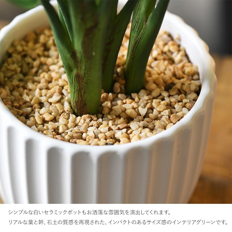 リアルな葉と幹、石土の質感を再現された、インパクトのあるサイズ感のインテリアグリーンです。