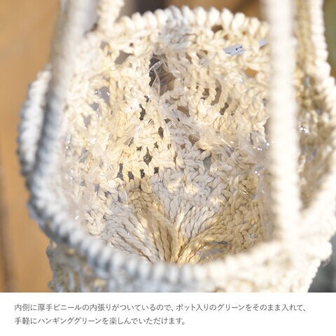 内側に厚手ビニールの内張りがついているので、ポット入りのグリーンをそのまま入れて、手軽にハンギンググリーンを楽しんでいただけます。