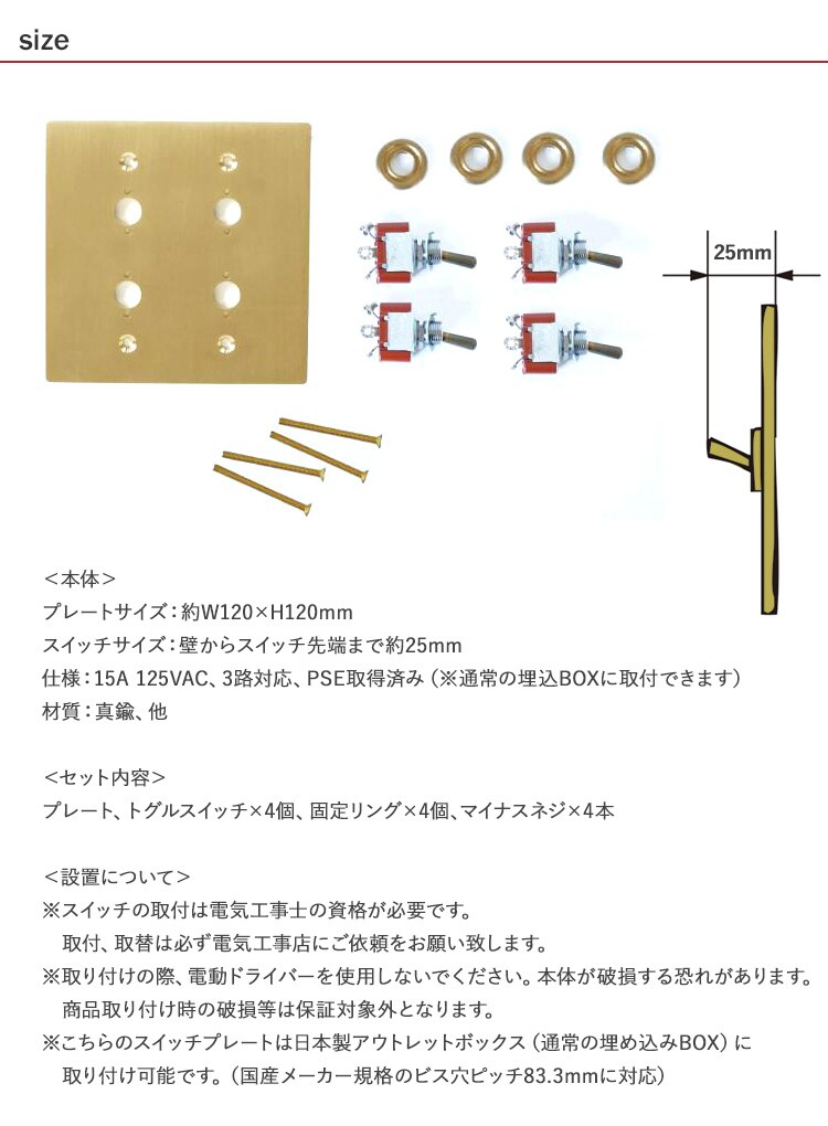 セット内容:プレート、トグルスイッチ×4個、 固定リング×4個、マイナスネジ×4本