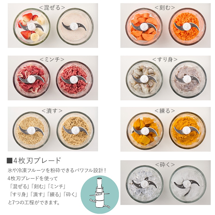 「混ぜる」「刻む」「ミンチ」「すり身」「潰す」「練る」「砕く」の7つの工程。