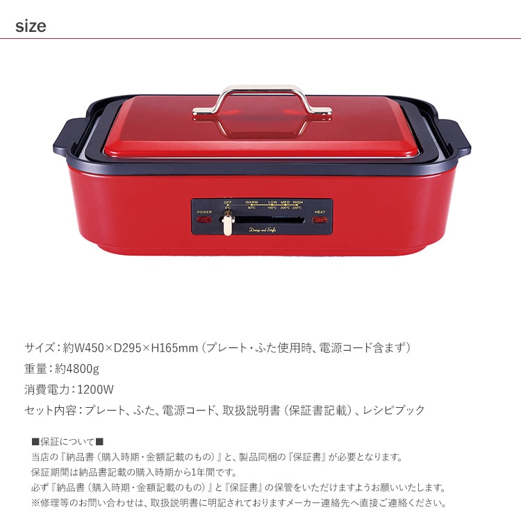 サイズ:約W450×D295×H165mm(プレート・ふた使用時、電源コード含まず)