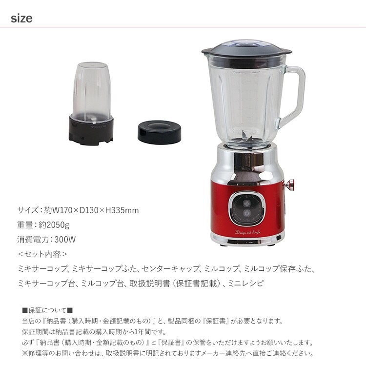 付属品:ミキサーコップ、ミキサーコップふた、センターキャップ、ミルコップ、ミルコップ保存ふた、ミキサーコップ台、ミルコップ台、取扱説明書(保証書記載)、ミニレシピ