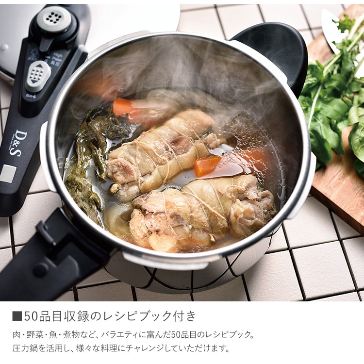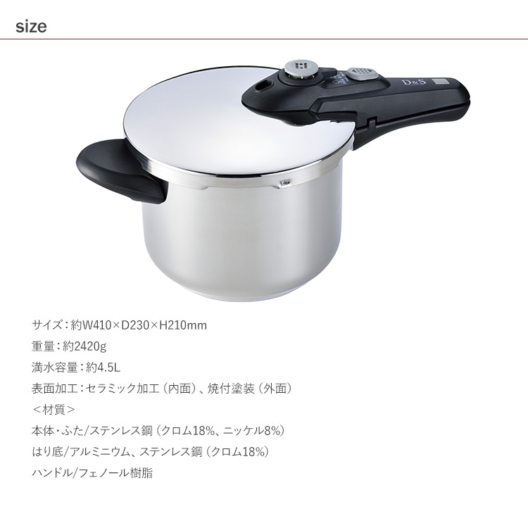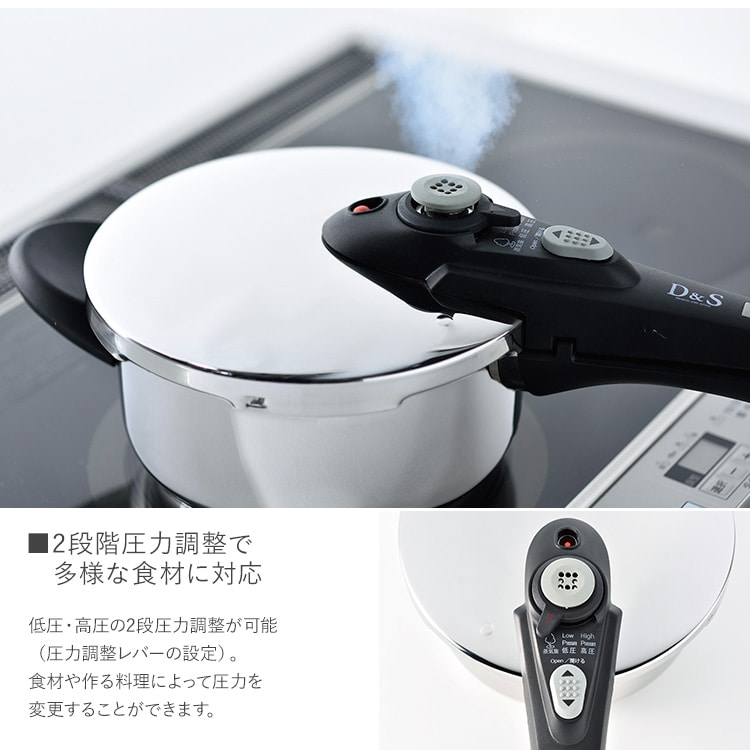 D&S 圧力鍋 4.5L 調理器具 鍋 時短 圧力調理 IH ガス 2段階圧力 高圧 低圧 レシピ付 キッチン