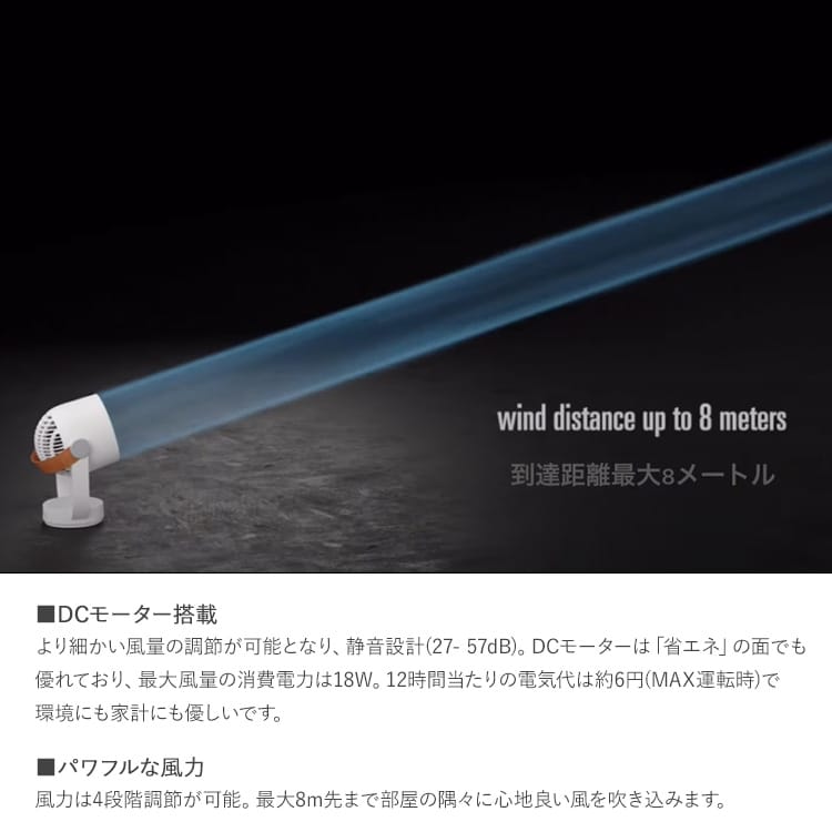 8m先まで届くパワフルな風力がお部屋の隅々まで広範囲に心地く風を吹き込みます。