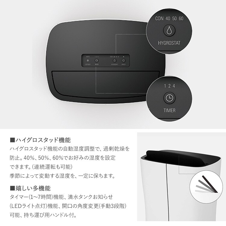 他機能:ハイグロスタッド機能、タイマー機能(1~7時間、満水タンクお知らせ機能)、開口の角度変更(手動3段階)