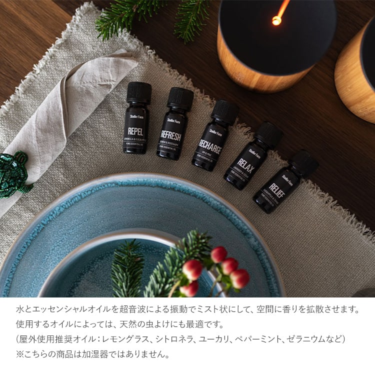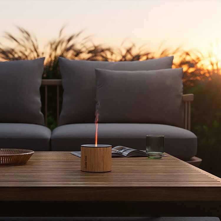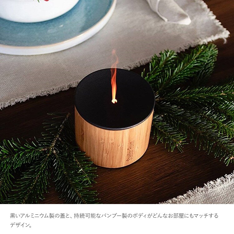 オイルと琥珀色の光が、ミストを炎のような演出にし、空間に穏やかな遊び心を生み出します。