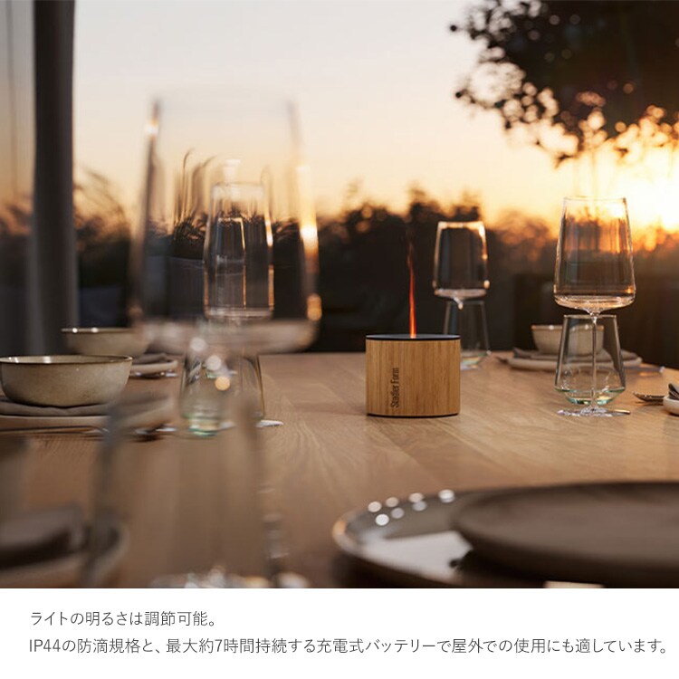 ライトの明るさは調節可能。IP44の防滴規格と、最大約7時間持続する充電式バッテリーで屋外での使用にも適しています。