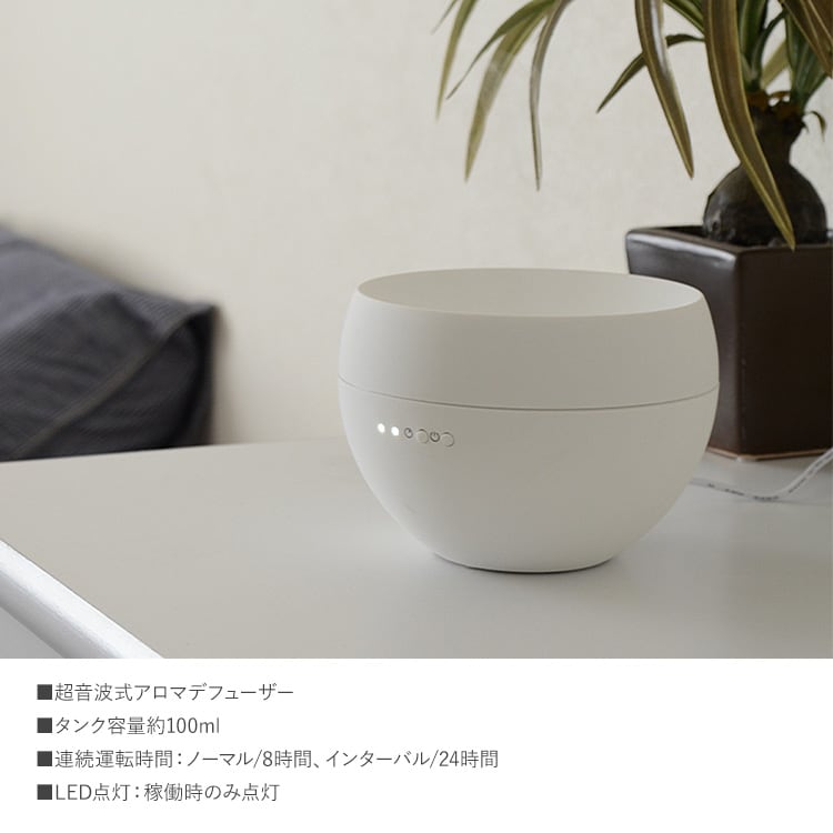 連続稼働約8時間のシンプルデザイン、まるいフォルムが特徴的なアロマディフューザー“Jasmine(ジャスミン)”。