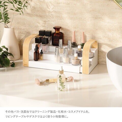 その他バス・洗面台ではクリーニング製品・化粧水・コスメアイテムを。リビングテーブルやデスクではよく使う小物整理に。