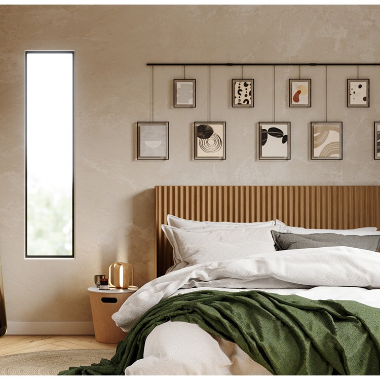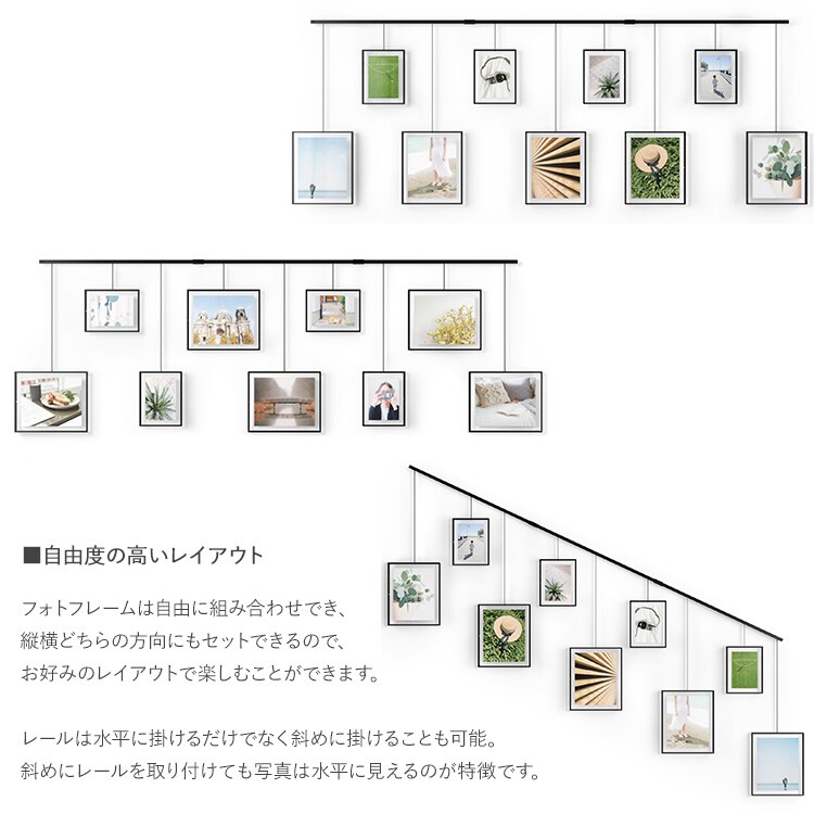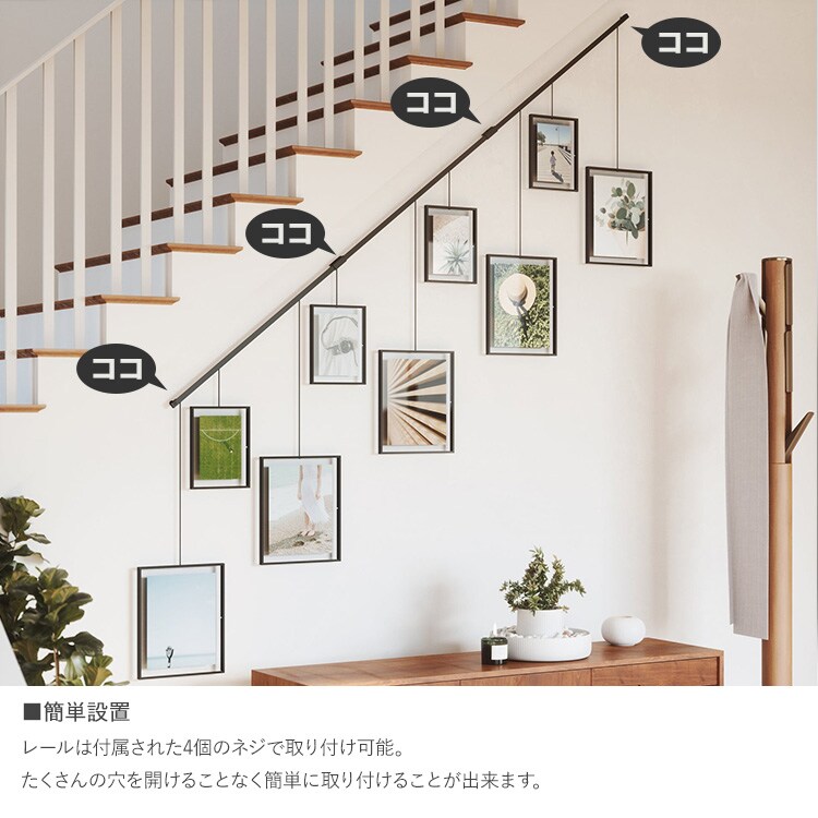 スッキリとしたレールからフォトフレームを吊り下げた、ギャラリースタイルのフォトフレーム。