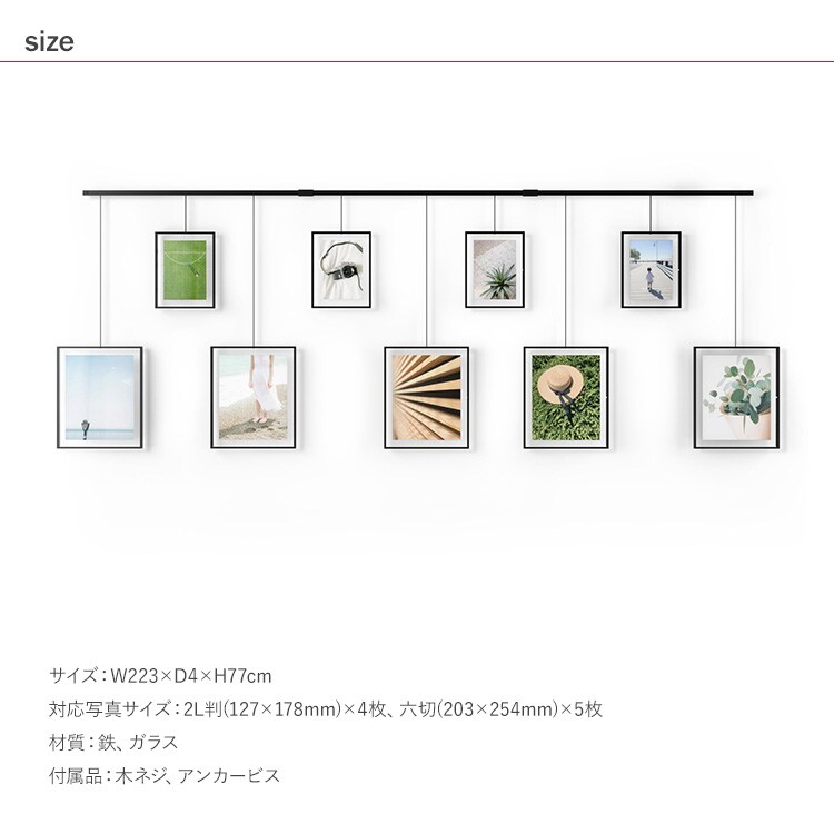 六切サイズの5つのフレーム、2Lサイズの4つのフレームと長さの違うフックが付属しています。