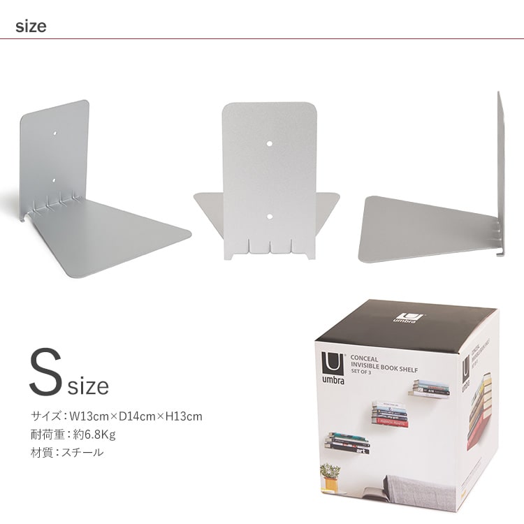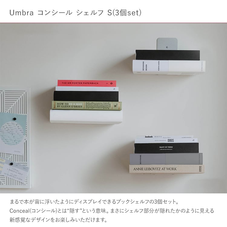 まるで本が宙に浮いたようにディスプレイできるブックシェルフの3個セット。Conceal(コンシール)とは“隠す”という意味。まさにシェルフ部分が隠れたかのように見える新感覚なデザインをお楽しみいただけます。サイズはS/Lの2種類。(こちらはSサイズのページです)付属のネジで壁に取り付けることができます。
