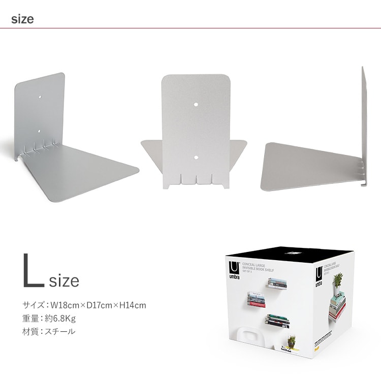 まるで本が宙に浮いたようにディスプレイできるブックシェルフの3個セット。Conceal(コンシール)とは“隠す”という意味。まさにシェルフ部分が隠れたかのように見える新感覚なデザインをお楽しみいただけます。サイズはS/Lの2種類。(こちらはLサイズのページです)付属のネジで壁に取り付けることができます。