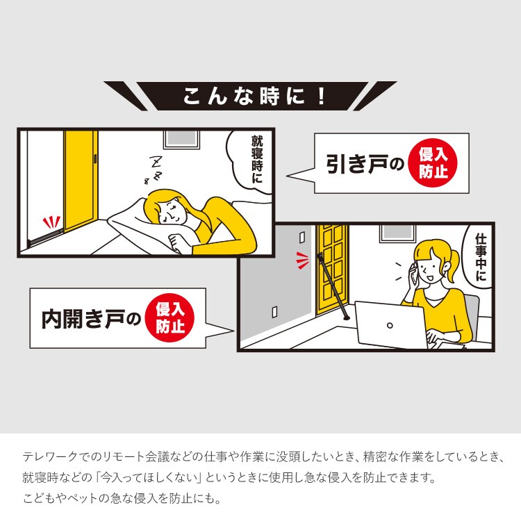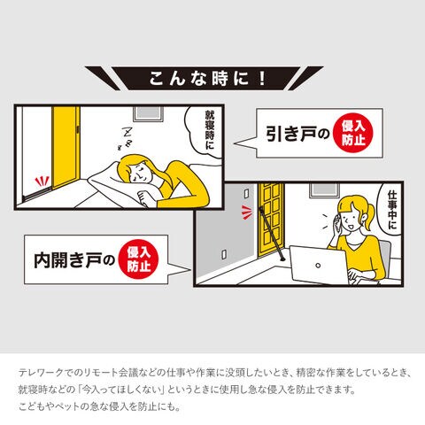 テレワークでのリモート会議などの仕事や作業に没頭したいとき、精密な作業をしているとき、就寝時などの「今入ってほしくない」というときに使用し急な侵入を防止できます。