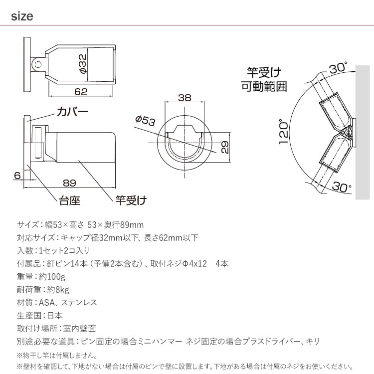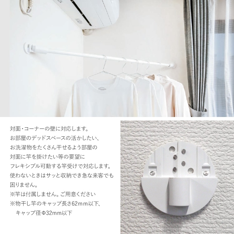 室内の壁にピンやネジで取り付けるだけの簡単設置!室内干しスペースを作ることができる竿受けパーツ。