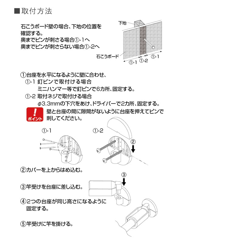 別途必要な道具:ピン固定の場合ミニハンマー ネジ固定の場合プラスドライバー、キリ
