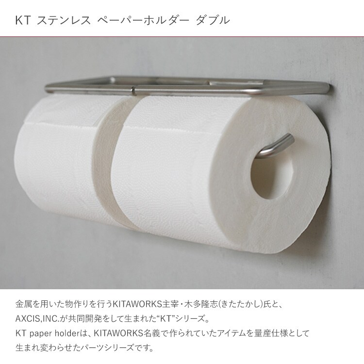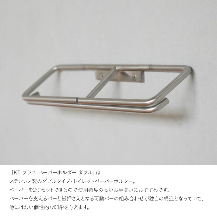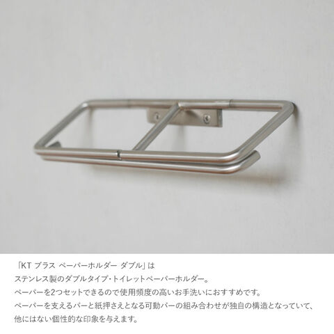 「KT ステンレス ペーパーホルダー ダブル」はステンレス製のダブルタイプ・トイレットペーパーホルダー。ペーパーを2つセットできるので使用頻度の高いお手洗いにおすすめです。
