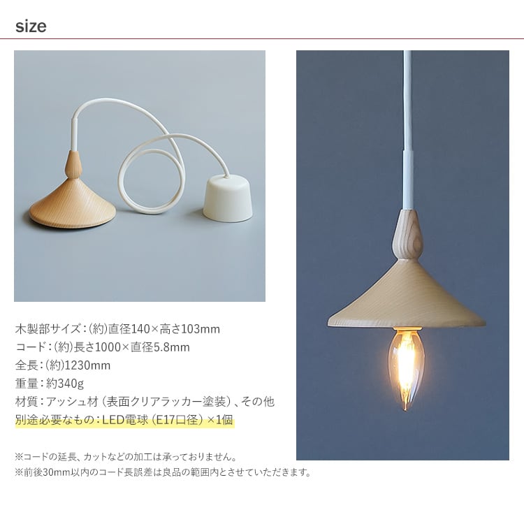 サイズ(約):木製部/直径140×高さ103mm、コード/長さ1000×直径5.8mm、全長/1230mm