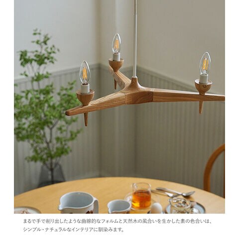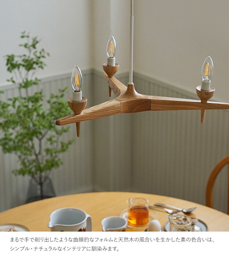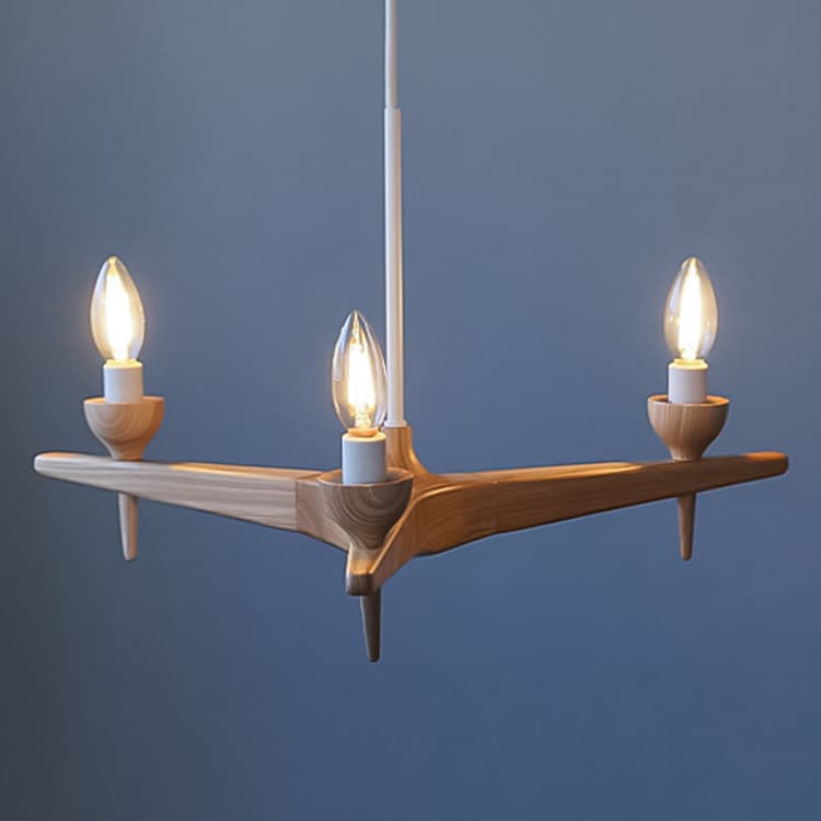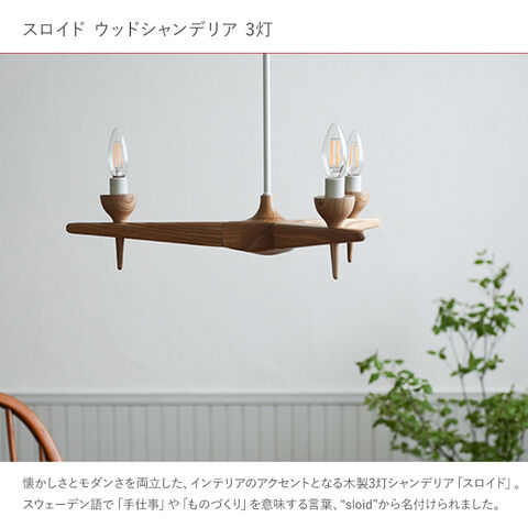 懐かしさとモダンさを両立した、インテリアのアクセントとなる木製3灯シャンデリア「スロイド」。