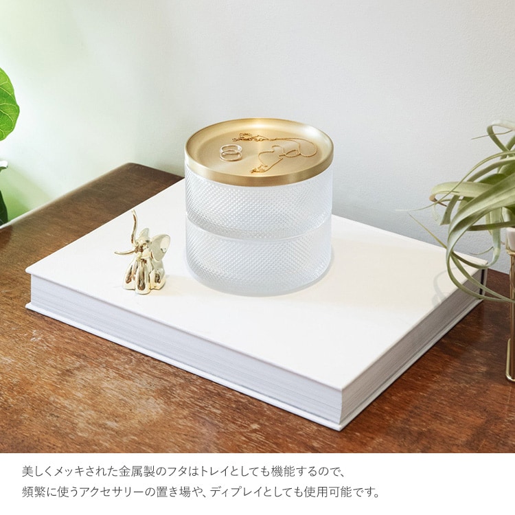 美しくメッキされた金属製のフタはトレイとしても機能するので、頻繁に使うアクセサリーの置き場や、ディプレイとしても使用可能です。