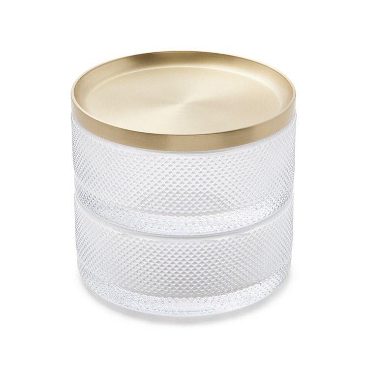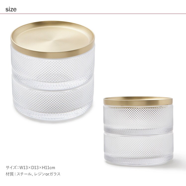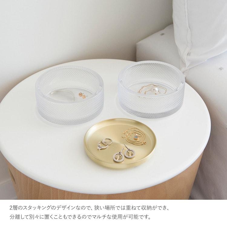 積み重ねたり分離ができる2段式のガラス製ジュエリーボックス。リング、ブローチ、イヤリングなどのアクセサリーを美しく保管できます。