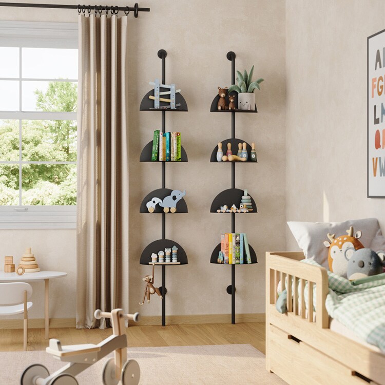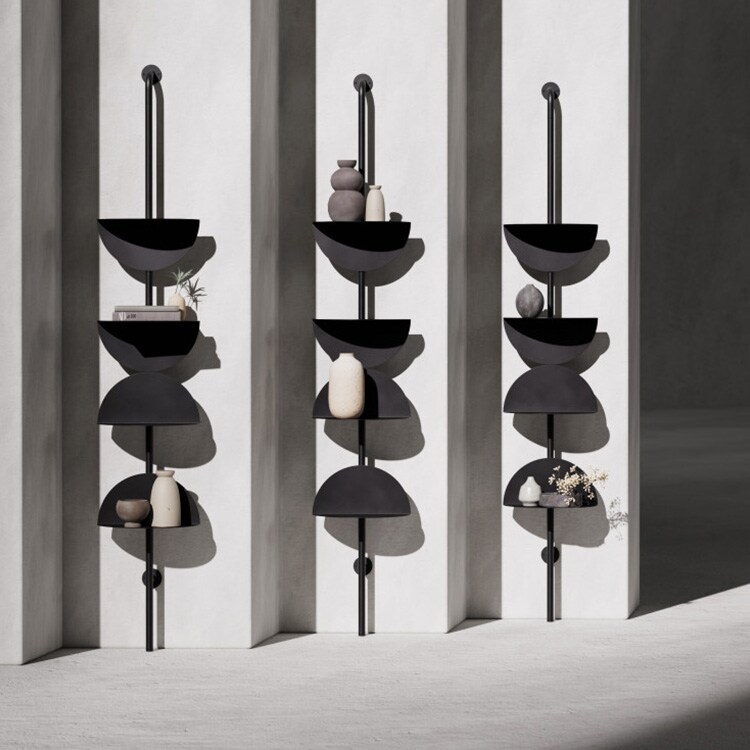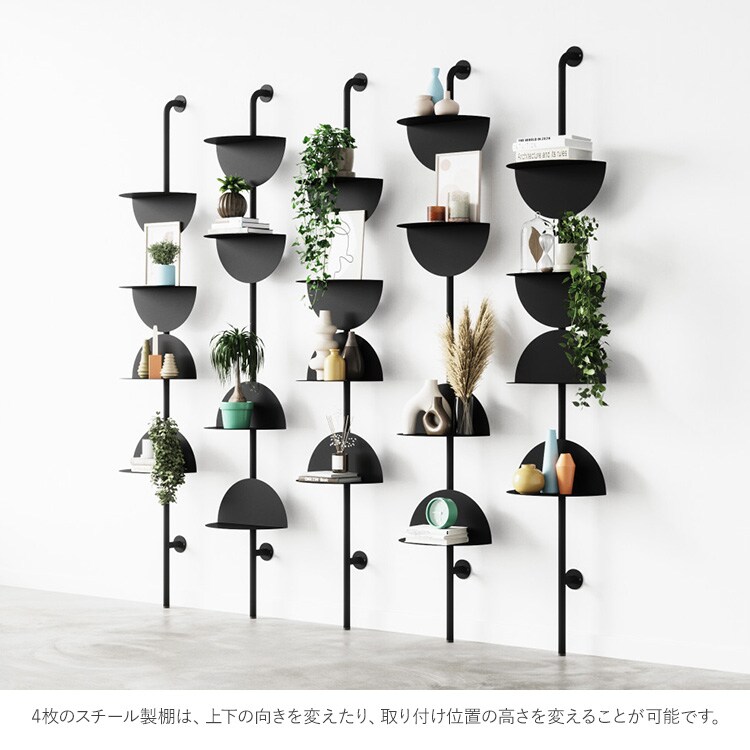 4枚の半円形のスチール製棚をポールに取り付けて使用します。