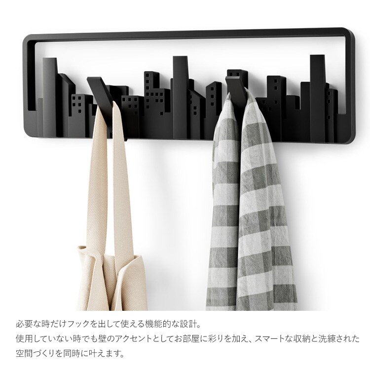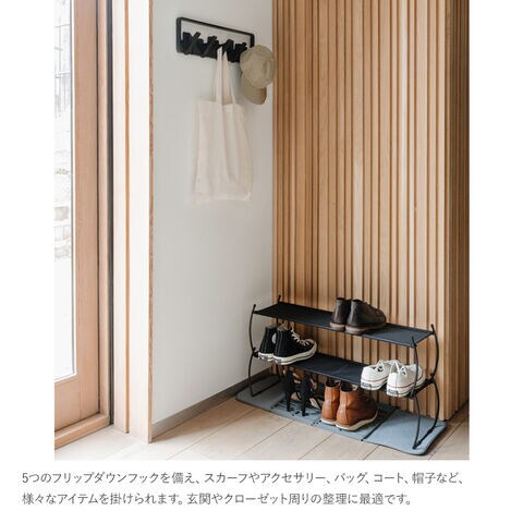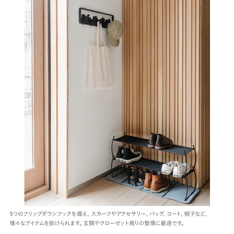 5つのフリップダウンフックを備え、スカーフやアクセサリー、バッグ、コート、帽子など、様々なアイテムを掛けられます。
