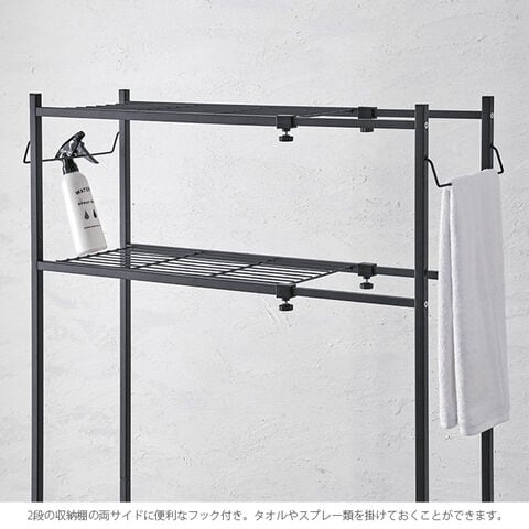 ・2段の収納棚の両サイドに便利なフック付き。タオルやスプレー類を掛けておくことができます。