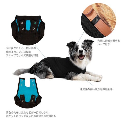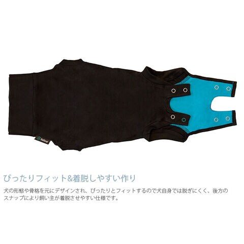 犬の形態や骨格を元にデザインされ、ぴったりとフィットするので犬自身では脱ぎにくく、後方のスナップにより飼い主が着脱させやすい仕様です。