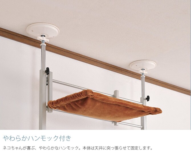 ネコちゃんが喜ぶ、やわらかなハンモック。本体は天井に突っ張らせて固定します。