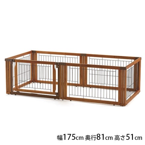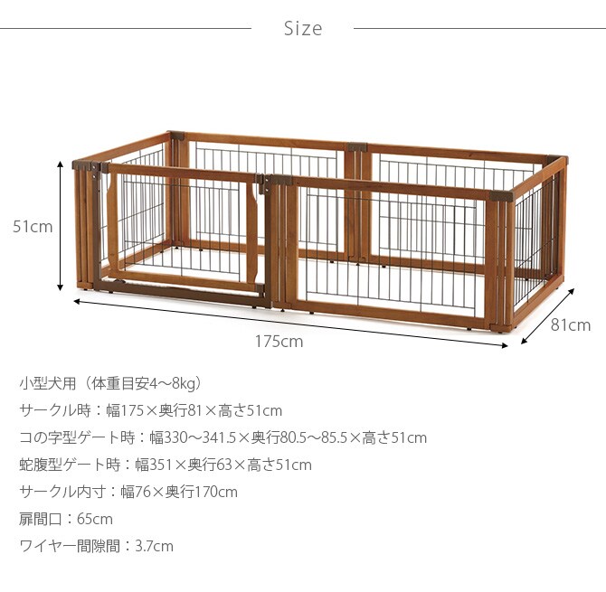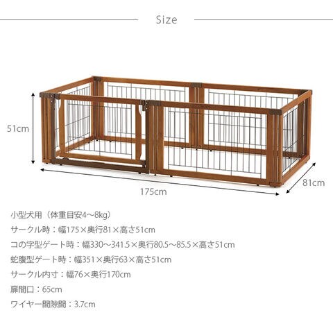 サークル時:幅175×奥行81×高さ51cmコの字型ゲート時:幅330~341.5×奥行80.5~85.5×高さ51cm蛇腹型ゲート時:幅351×奥行63×高さ51cmサークル内寸:幅76×奥行170cm扉間口:65cmワイヤー間隙間:3.7cm