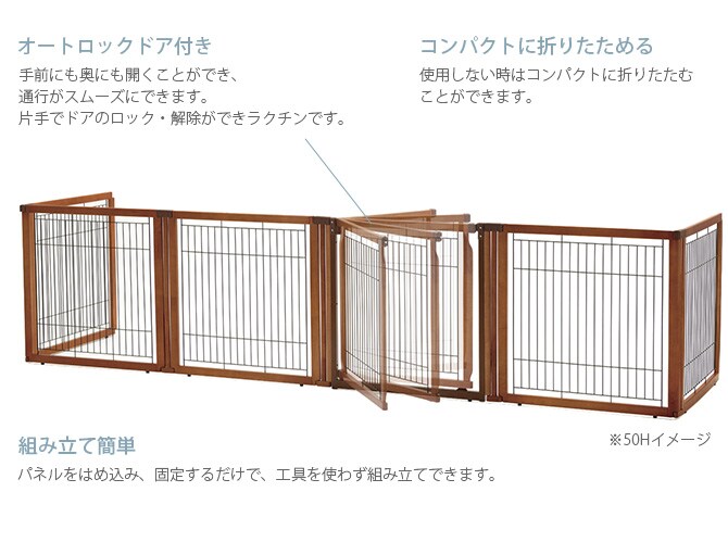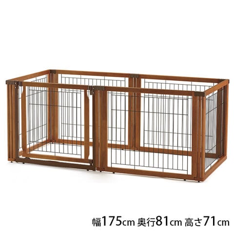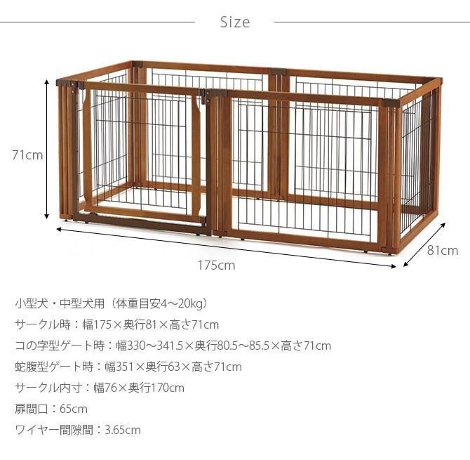 サークル時:幅175×奥行81×高さ71cmコの字型ゲート時:幅330~341.5×奥行80.5~85.5×高さ71cm蛇腹型ゲート時:幅351×奥行63×高さ71cmサークル内寸:幅76×奥行170cm扉間口:65cmワイヤー間隙間:3.65cm