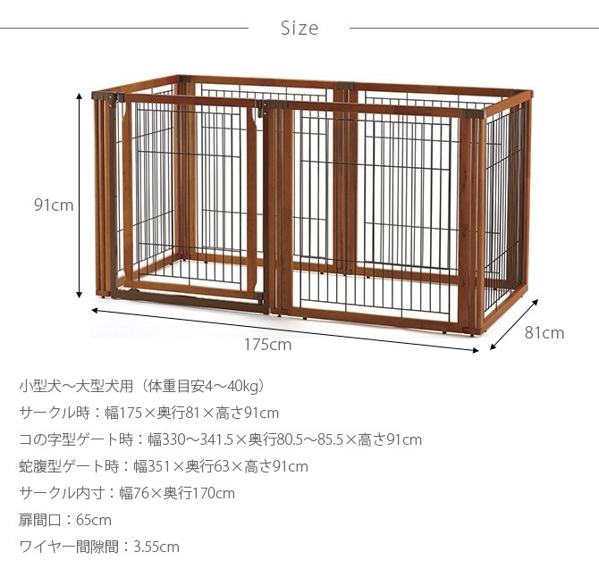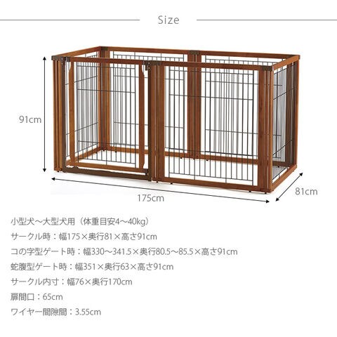 サークル時:幅175×奥行81×高さ91cmコの字型ゲート時:幅330~341.5×奥行80.5~85.5×高さ91cm蛇腹型ゲート時:幅351×奥行63×高さ91cmサークル内寸:幅76×奥行170cm扉間口:65cmワイヤー間隙間:3.55cm