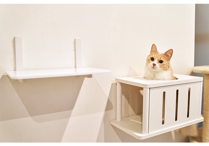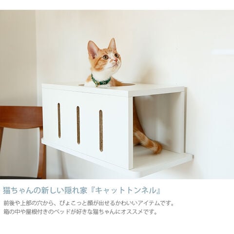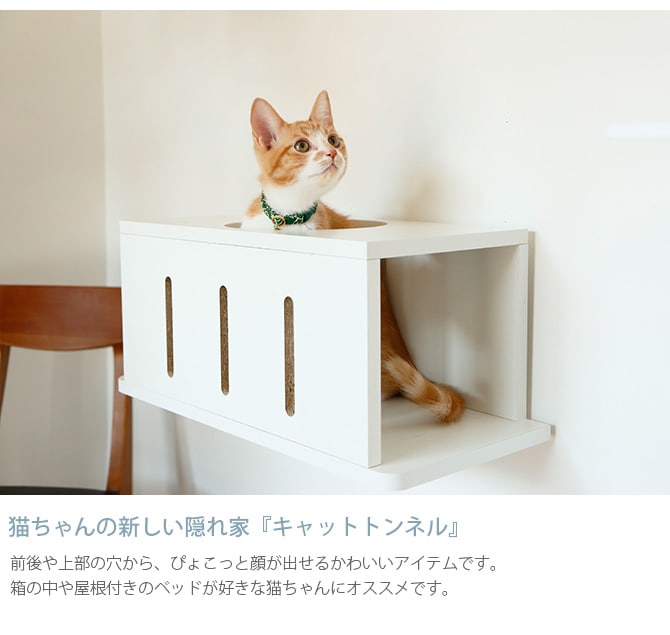 前後や上部の穴から、ぴょこっと顔が出せるかわいいアイテムです。箱の中や屋根付きのベッドが好きな猫ちゃんにオススメです。